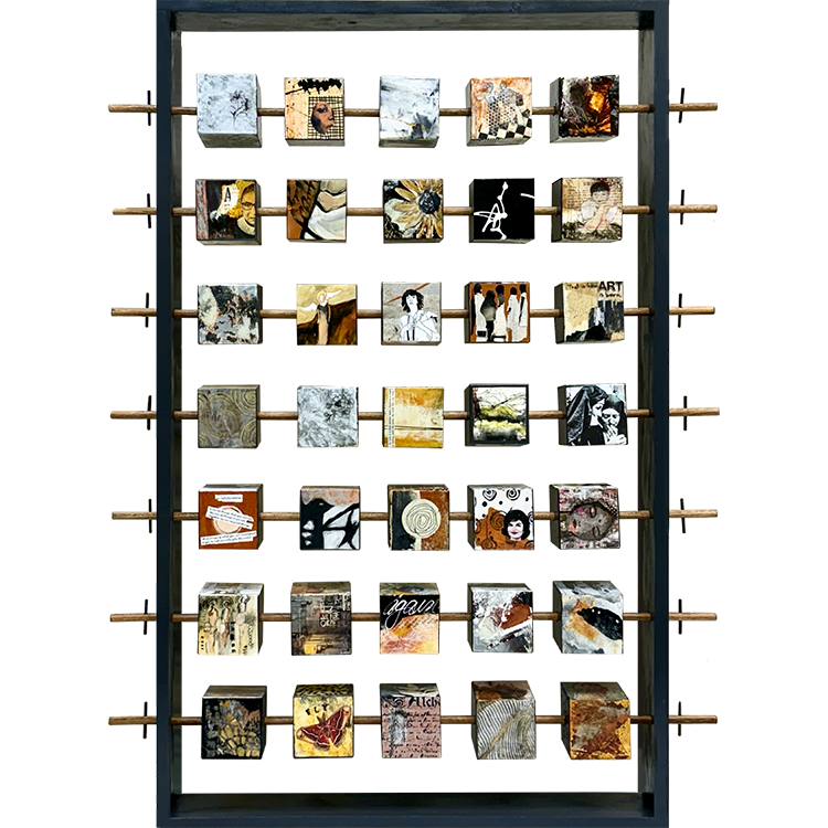 Each artist created their assigned six-sided blocks using acrylic, ephemera, and hand-painted paper. Within the shared palette, themes emerged: life experiences, the female form, faces, abstract shapes, and occasional text. The idea of presenting the finished blocks in an abacus-like structure grew from group discussion after one member spied a child’s toy abacus. Another member built the wooden framework, inserting dowels that allow the blocks to slide and rotate freely. Selecting the initial front-facing arrangement became a spirited collective act.