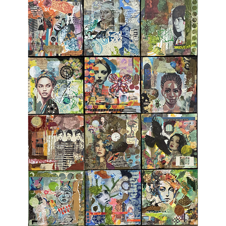 We chose to use mixed media for each of these twelve artworks which allowed us greater freedom in our choices of tools and materials. Each canvas is an artwork to which we each contributed. We were able to insert our own personalities by choosing specific materials for each canvas to enhance and strengthen the pieces and use the skills and talents we each possess. We felt the faces of the women on each canvas were important to convey our message that, while this artwork was about and created by a collaboration of women artists who are friends, it represents the friendships of women from all around the world.