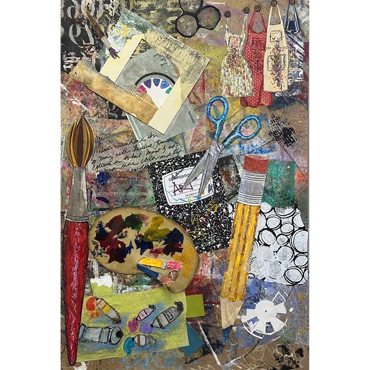 The canvas serves as the foundation, offering a space where ideas can exist and grow. The paint and collage features incorporate emotion, color, and movement, transforming our collaboration into visual form. The combinations of paper, fodder, mark making, and textural elements shaped those ideas, allowing for detail, and uniqueness. Each artist’s tool leaves its own mark, collaboratively contributing individuality to the final composition. An apron plays a significant role, protecting an artist while recording the history of the creation through stains and marks. The 4 aprons symbolize the 4 unique artist collaborators.